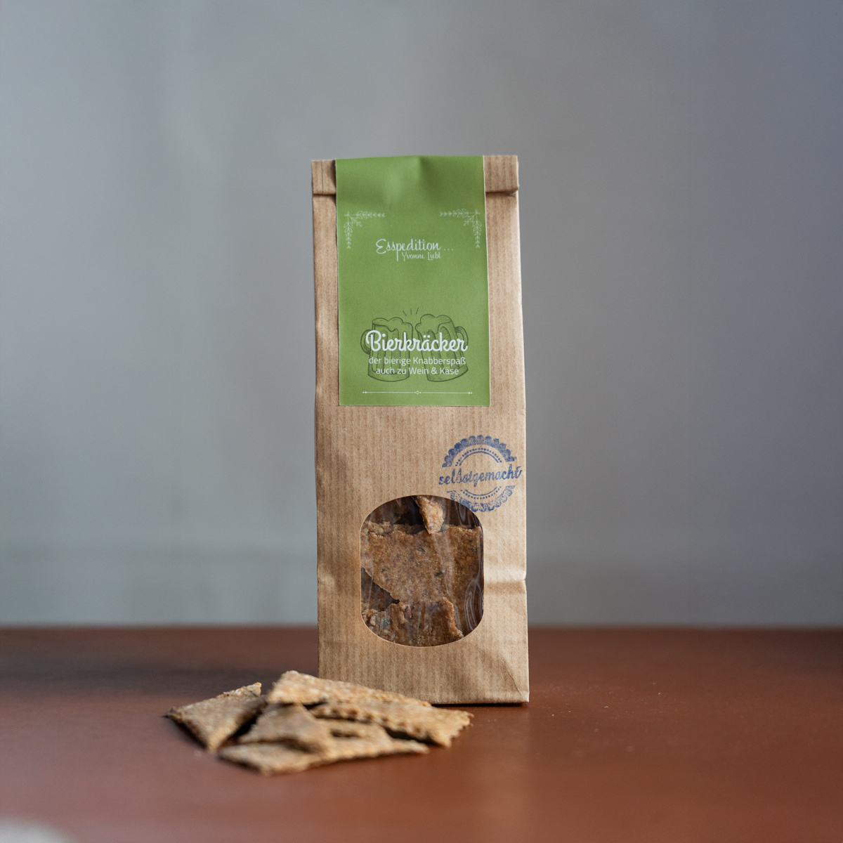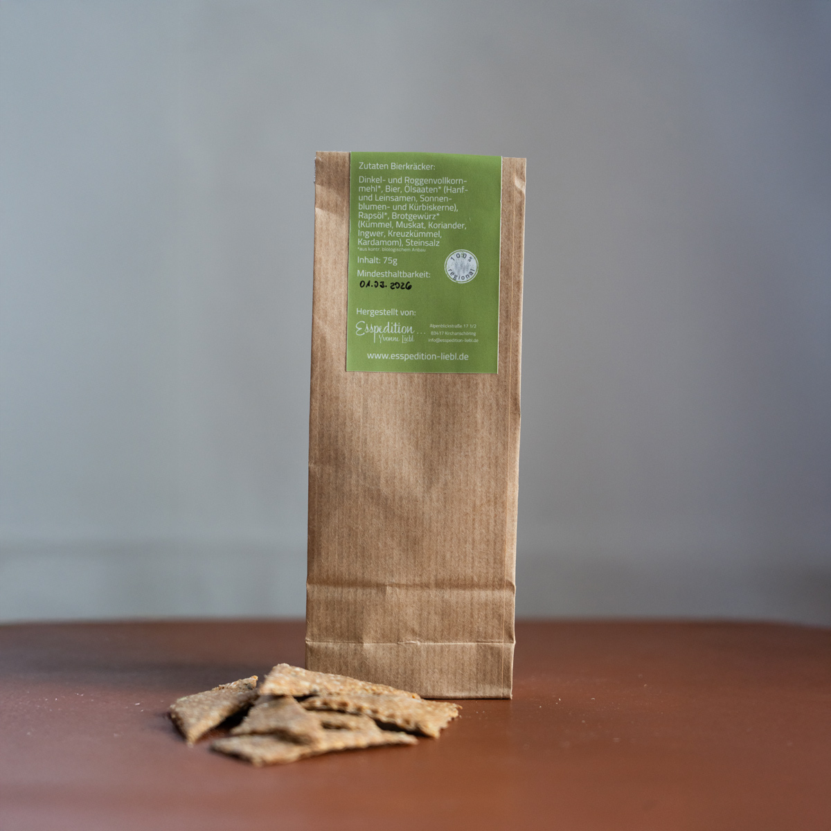 Der bierige Knabberspaß aus Dinkel— und Roggenvollkornmehl mit Ölsaaten wie Hanf- und Leinsamen, Sonnenblumenkerne, Kümmel, Muskat, Koriander und Kardamom und natürlich heimischem Bier. 100% REGIONAL